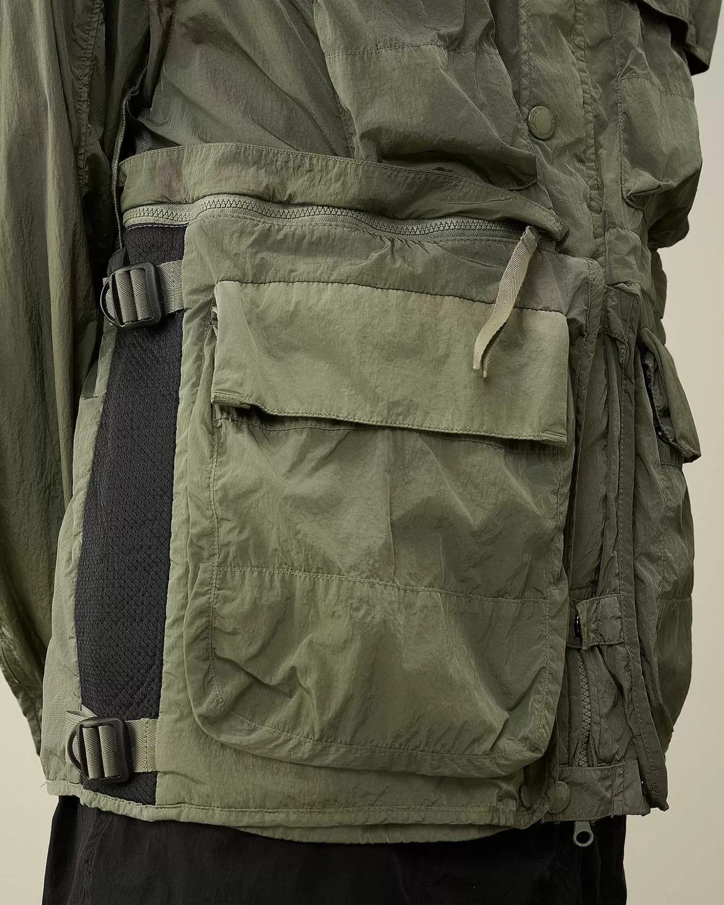 Veste Fonctionnelle Avec Capuche Goggle Hood Amovible, Col Classique Et Fermeture Zippée Tout Du Long Sous Un Rabat-Tempête Boutonné. Des Poches Poitrine Sécurisées, Des Poignets Réglables Et Le Détail En Forme De Verre De Lunette C.P. Company Complètent L’Ensemble. Les Manches Zippées Sont Amovibles Et Les Poches Sécurisées Inférieures Peuvent Être Portées En Guise De Veste Sans Manches. Le Chrome-R Se Compose À 100 % De Nylon Recyclé Pré-Consommation, Obtenu À Partir De Déchets De Production Détournés Du Circuit D’Élimination Des Déchets Et Revalorisés, Qui Donnent À La Matière Une Nouvelle Vie. Il Est Ensuite Teint En Pièce Pour Plus De Profondeur Et D’Intensité Dans Les Couleurs. Coupe Droite.