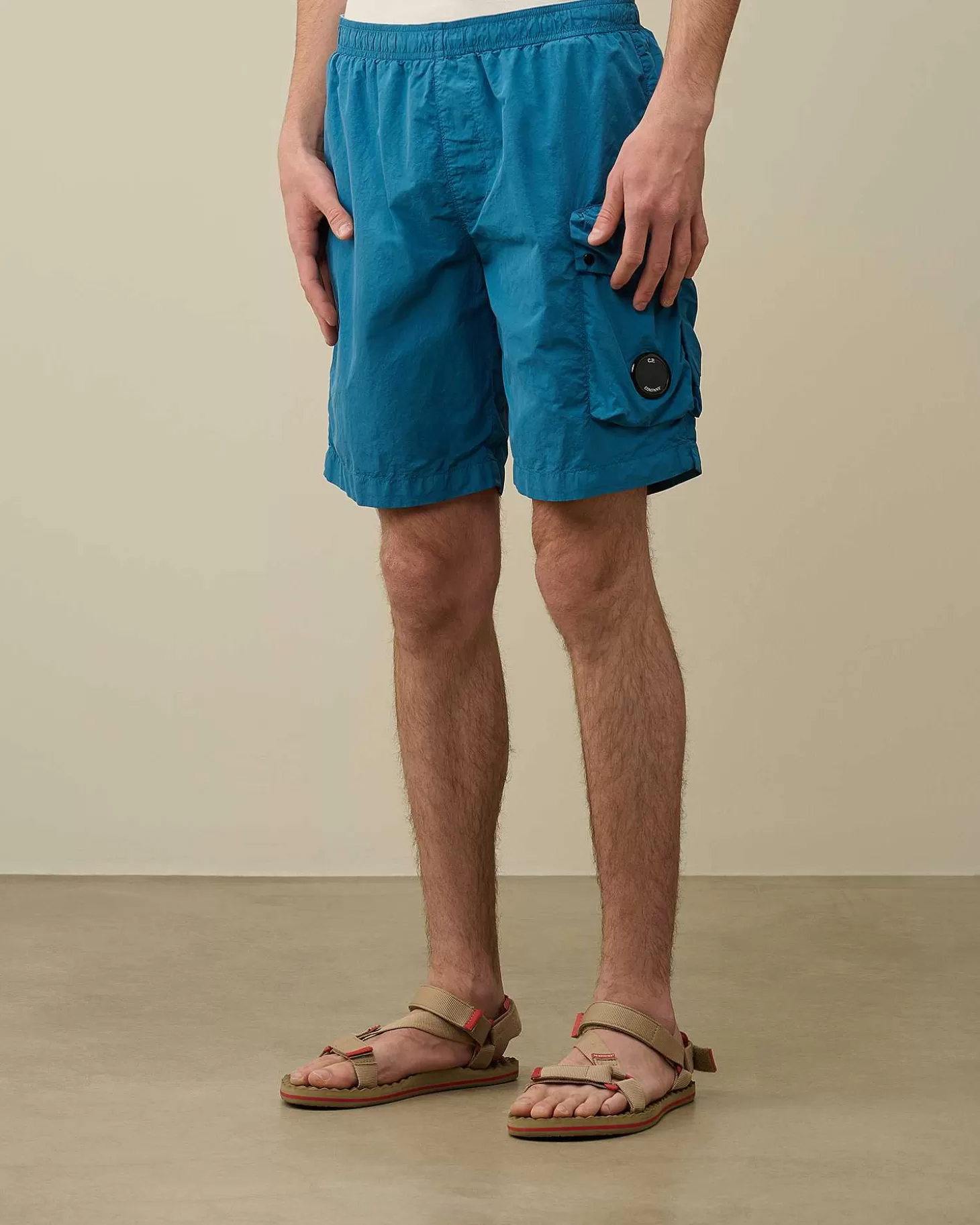 Short De Bain Longueur Genoux Avec Doublure En Mesh Et Taille Réglable À Cordons De Serrage Et Deux Poches Sur La Jambe Gauche Portant Le Détail En Forme De Verre De Lunette C.P. Company. Modèle Confectionné En Flatt Nylon, Un Nylon Émerisé, Également Dit « Sablé ». Le Tissu Ainsi Produit Est Plus Doux Et Présente Un Fini Plus Mat, Semblable À Un Tissu Qui A Été Porté Et Lavé De Nombreuses Fois. Modèle Teint En Pièce Pour Plus De Profondeur Et D’Intensité Dans Les Couleurs. Coupe Droite.
