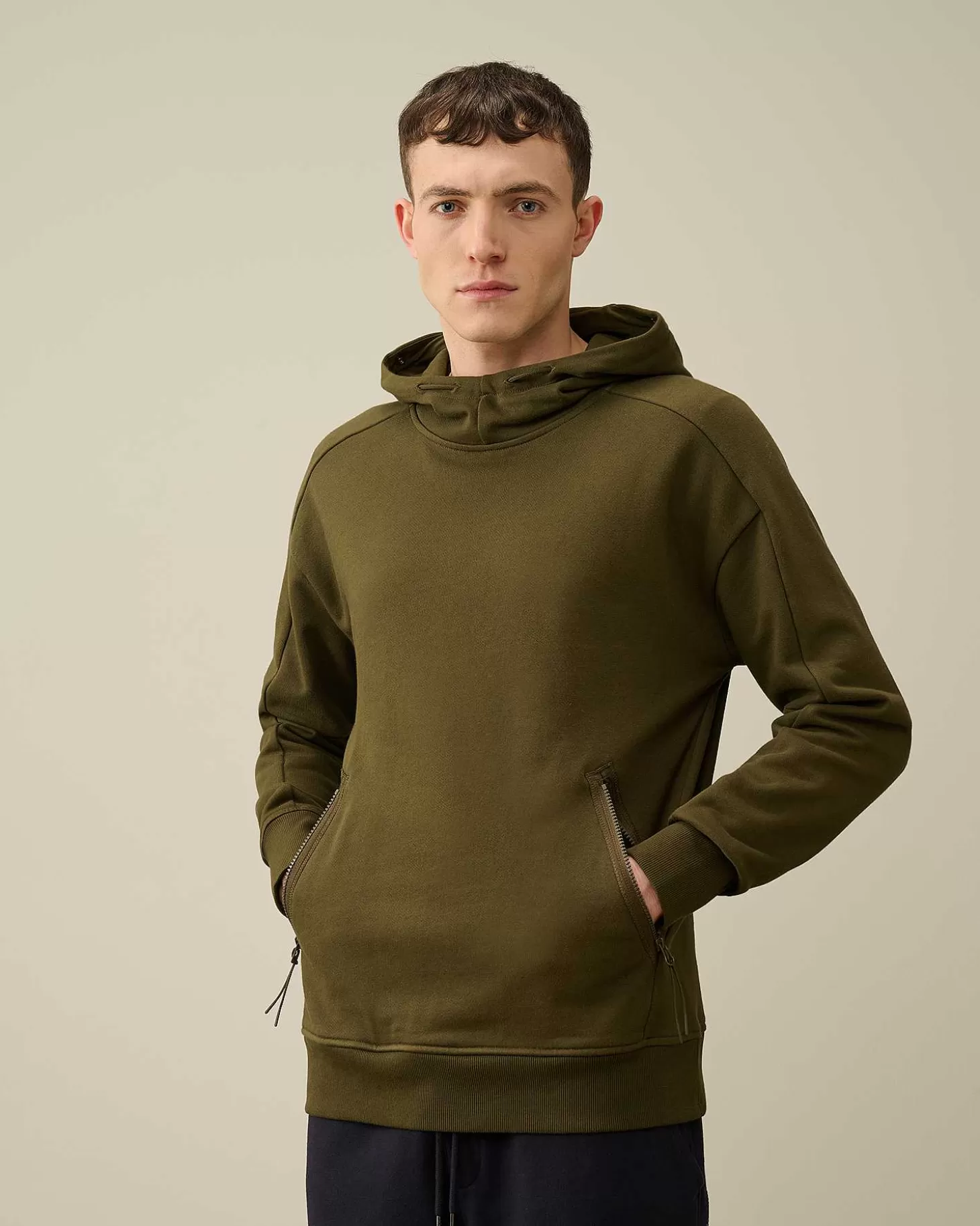 Sweat Doté D’Une Capuche Ajustable Rehaussée De L’Emblématique Détail En Forme De Verre De Lunette C.P. Company. Ce Modèle Présente Également Deux Poches Zippées En Biais, Ainsi Qu’Un Ourlet Et Des Poignets Côtelés. Confectionné Dans Un Molleton En Relief Diagonal, Un Coton Bouclé Mi-Épais Offrant Un Confort Absolu Et Une Grande Robustesse. Coupe Droite.